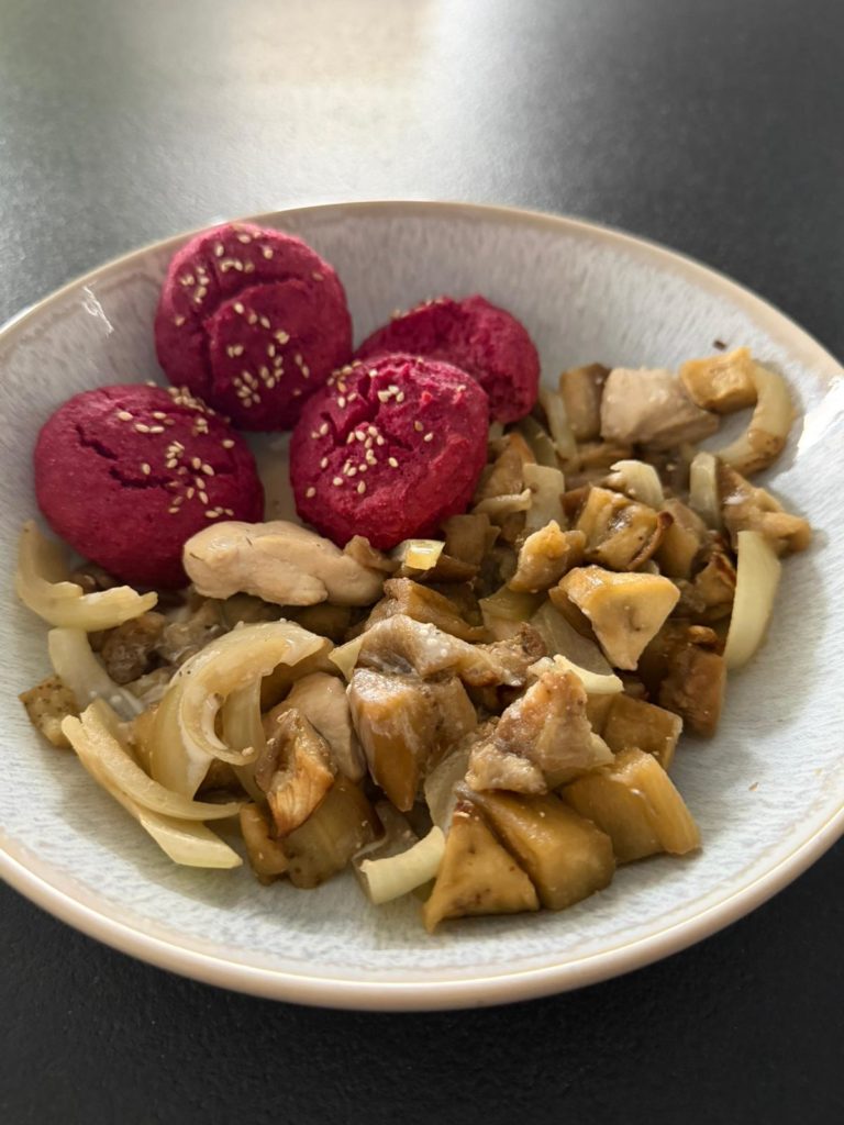 - Déposer le contenu de la poêle dans les assiettes, verser la sauce dessus et servir les petits pains à la betterave maison
